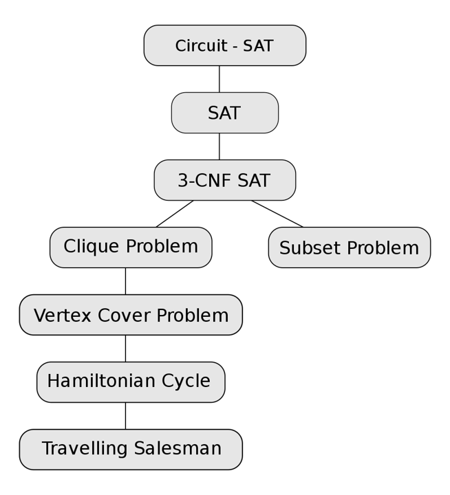 这个问题最初是通过证明它在 NTM 上可以多项式时间内解决证明出它是 NP-C 问题。如下图所示是 NP-C 问题的归约路线:
