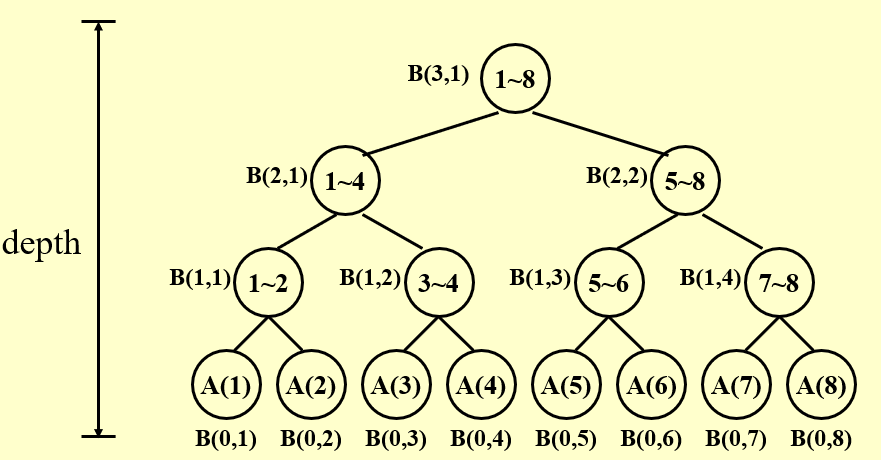 在并行的视角下,我们可以采用每次两两相邻求和的方式,会得到如下求和树图。其中我们定义了 \(B(h,i)\) 代表着自下而上第 \(h\) 层的第 \(i\) 个节点子树内的和。则很轻易可以得到: