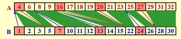令 \(p=\dfrac{n}{\log n}\),在 \(A,B\) 中均匀地取出 \(p\) 个数作为 pivot。然后对这些 pivot 做二分查找,就能得到它们的排名,一个平凡的结论是,它们的排名不会相交,可以参考下图来理解这一点: