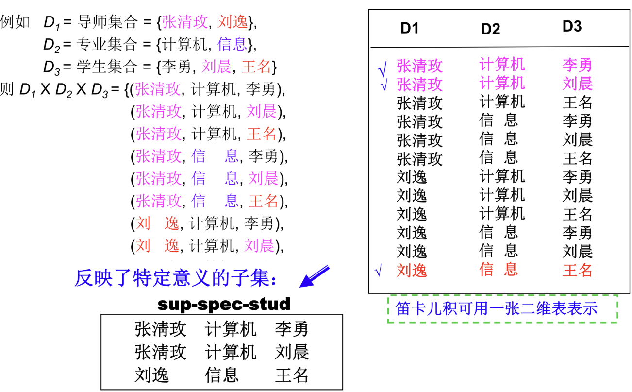 关系(relation)的正式定义:对于集合 \(D_1,D_2,D_3,\cdots,D_n\),关系 \(r\) 被定义为 \(D_1\times D_2\times \cdots \times D_n\) 的一个子集。