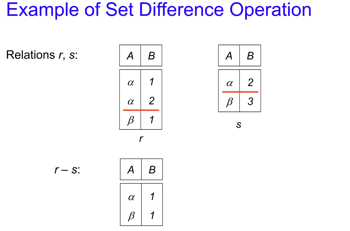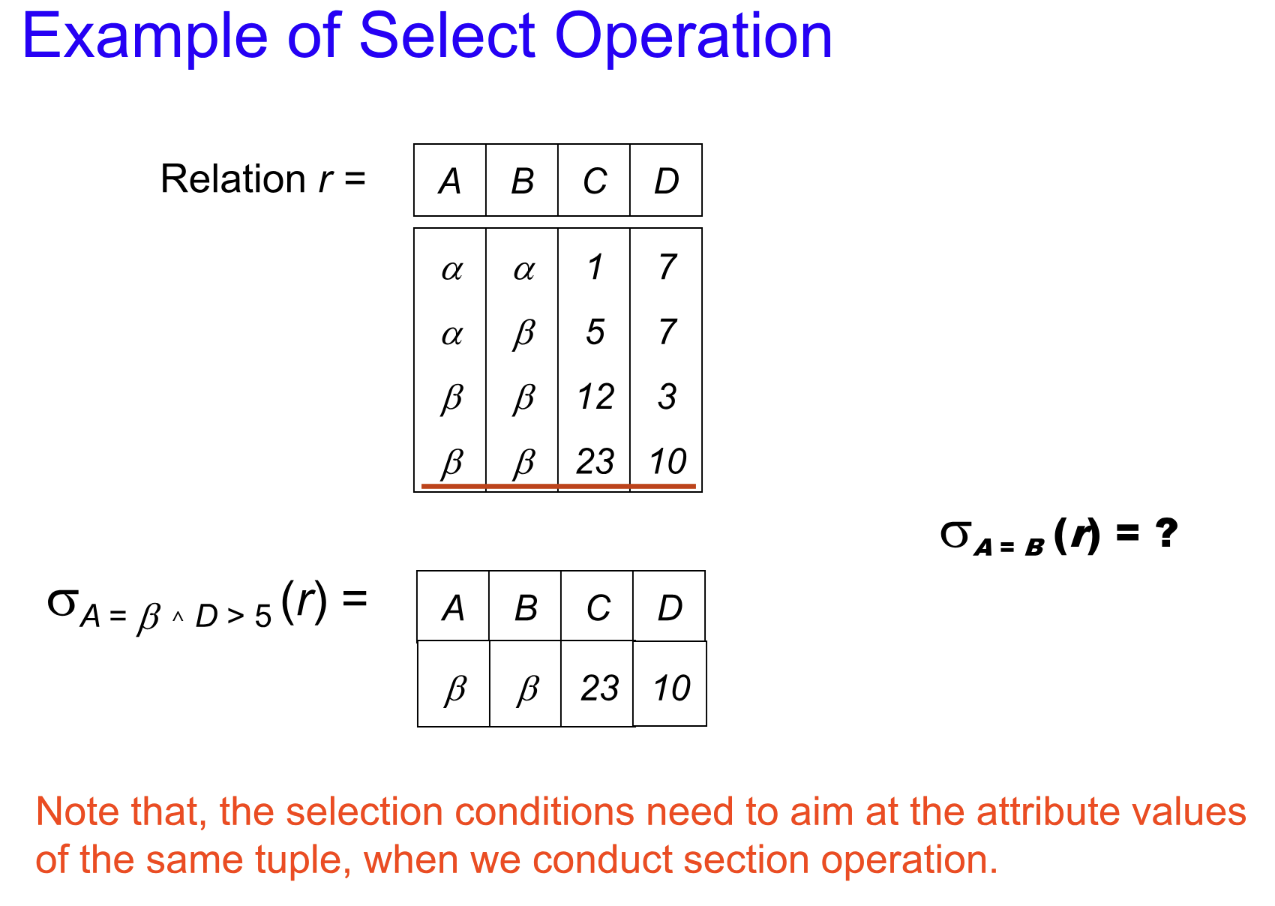 其中,\(p\) 是逻辑或算术命题。可以用与或非来连接多个分句。其意义是从关系中选取出满足 \(p\) 约束的元组。