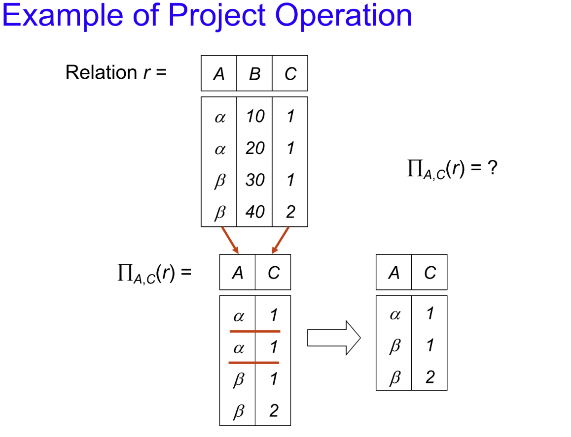 其中 \(A_i\) 为属性的子集。其意义是仅保留关系中对应属性的列,然后进行去重。这一过程与多维向量在广义平面上进行投影的过程十分相似,所以应该不难理解为什么称该操作为投影。