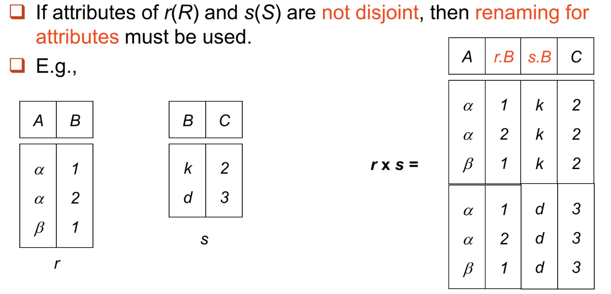 笛卡尔积,如果两个关系有相同的属性,则需要对属性分别命名而不能直接合二为一。