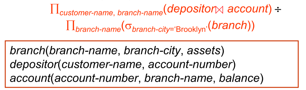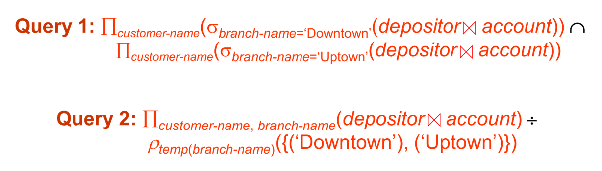 想要找到所有有 Downtown 和 Uptown 账户的客户。本来我们会需要对 depositor 和 account 作笛卡尔积,然后筛选出满足条件的账户的名字,最后再对二者求交,因为我们需要两个分支都有。那么我们现在可以直接使用自然合并,然后直接选,可以使式子简便不少。或者呢,我们可以直接创建一个包含两个支行名字的关系,然后用除法的方式代替作一次交。