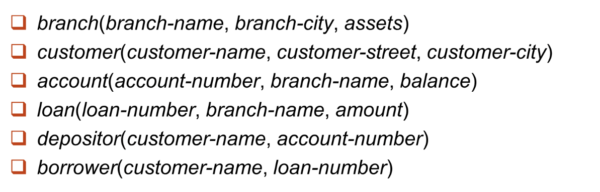 下面我们用银行存储账户的数据库来举例,如下为银行数据库中的关系模型。