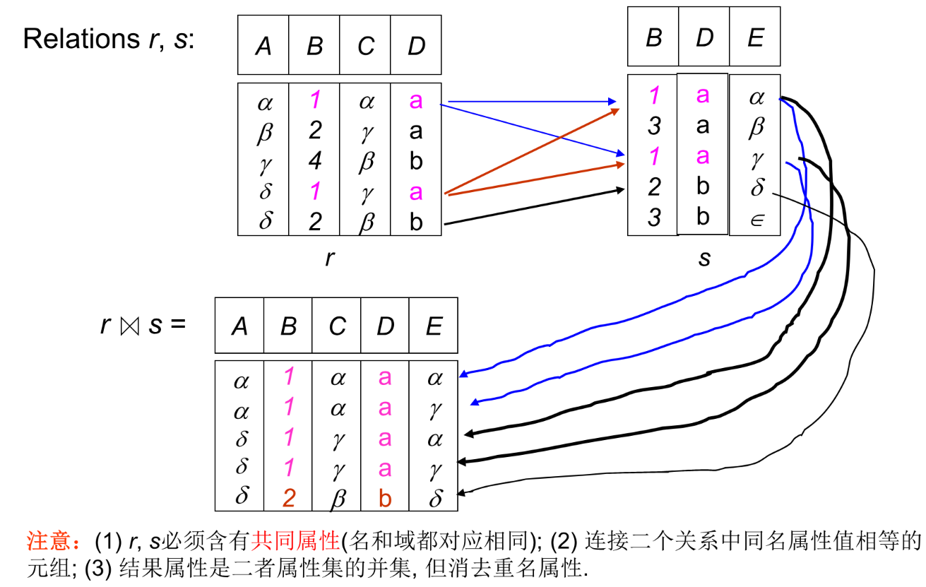 同时,根据以上表述,如果我们有关系 \(r(A,B,C,D),s(B,D,E)\),那么: