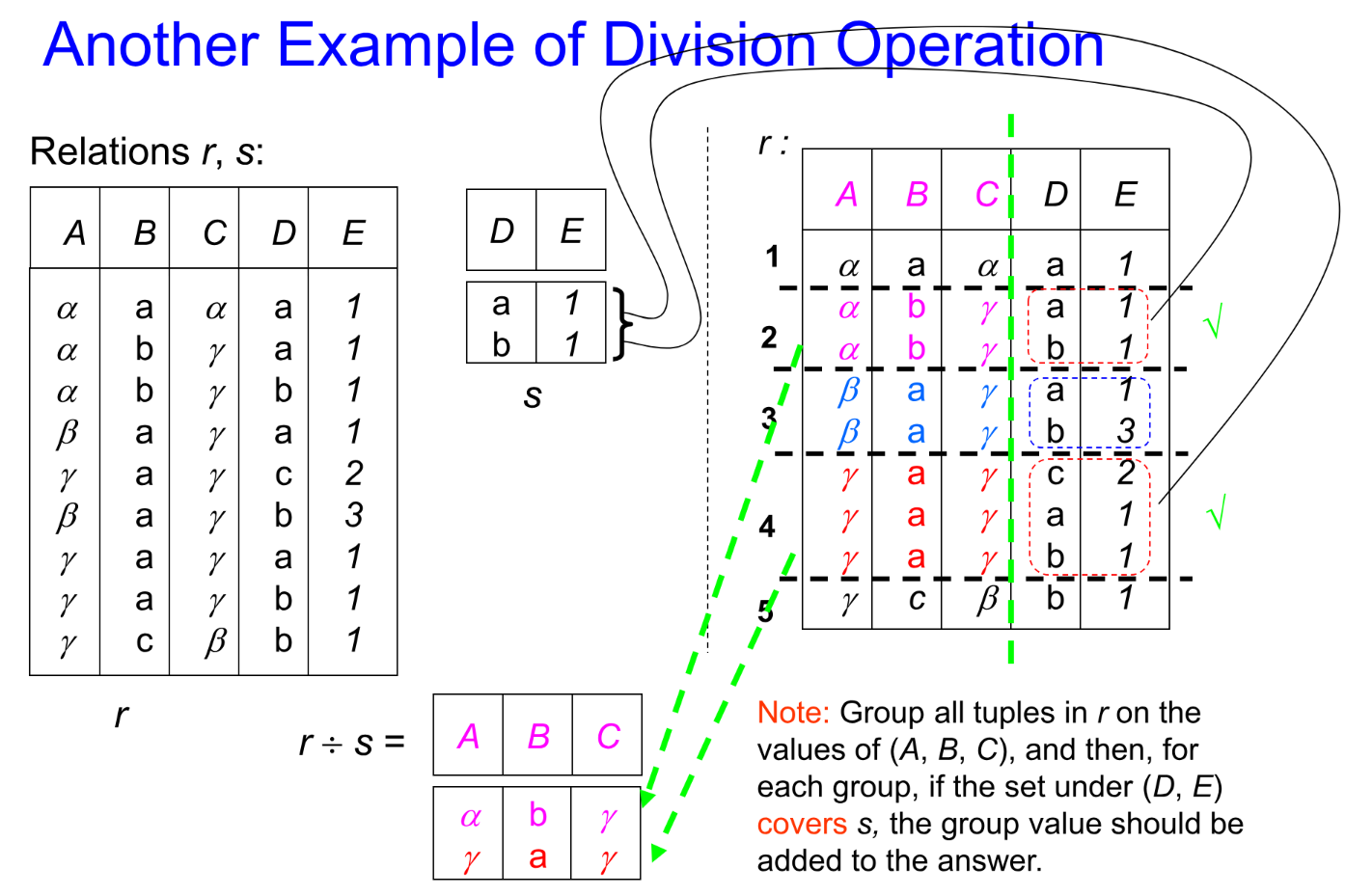 在一些语境下,我们希望在一个关系中找满足所有的条件的元组。也就是 for all 这样一个关键字。我们可以用除法。如果 \(r\) 关系中有属性 \(A_1,A_2,\dots,A_n,B_1,B_2,\dots,B_m\),而 \(s\) 关系中有 \(B_1,B_2,\dots,B_m\),则除法就是在 \(r\) 中对于 \(A\) 属性相同的元组,如果其 \(B\) 属性覆盖了 \(s\) 中所有情况,则其成为商的一个元组。